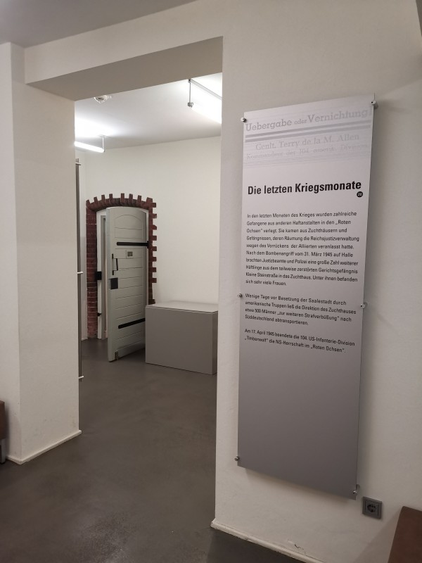 Der „Rote Ochse“ Halle (Saale), während der NS-Diktatur zunächst ein Gefängnis, diente ab 1935 für den Vollzug von Zuchthausstrafen gegen Männer und verfügte ab Herbst 1942 über eine Richtstätte. Mit einer Guillotine und durch den Strang wurden bis Kriegsende insgesamt 549 Frauen, Männer und Jugendliche aus insgesamt 15 Ländern hingerichtet. Am 17. April 1945 besetzte die 104. U.S. Infantry Division „Timberwolf“ unter Kommando vom Maj. Gen. Terry de la Mesa Allen die Stadt Halle und befreite auch die Gefangenen aus dem Zuchthaus. Die „Timberwölfe“ blieben bis Mitte oder Ende Mai 1945 und wurden dann durch eine Panzereinheit abgelöst. Besatzungswechsel war hier, wie überall in Mitteldeutschland, am 30. Juni / 1. Juli 1945.
