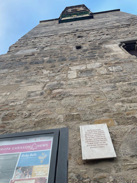 Der Rote Turm, für die Menschen aus Halle ein Wahrzeichen ihrer Stadt, wurde 1418 errichtet, wobei der Bau erst 1506 vollendet wurde. Der Turm ist mit seinen über 84 Metern der höchste freistehende Glockenturm Europas und verfügt mit seinen 76 Glocken über das größte funktionierende und genutzte Glockenspiel auf unserem Kontinent. Der Turm brannte am 16. April 1945 durch amerikanischen Artilleriebeschuss aus und verlor seinen charakteristischen Turmhelm. Bis auf die Turmumbauung wurde er 1976 wiederhergestellt.